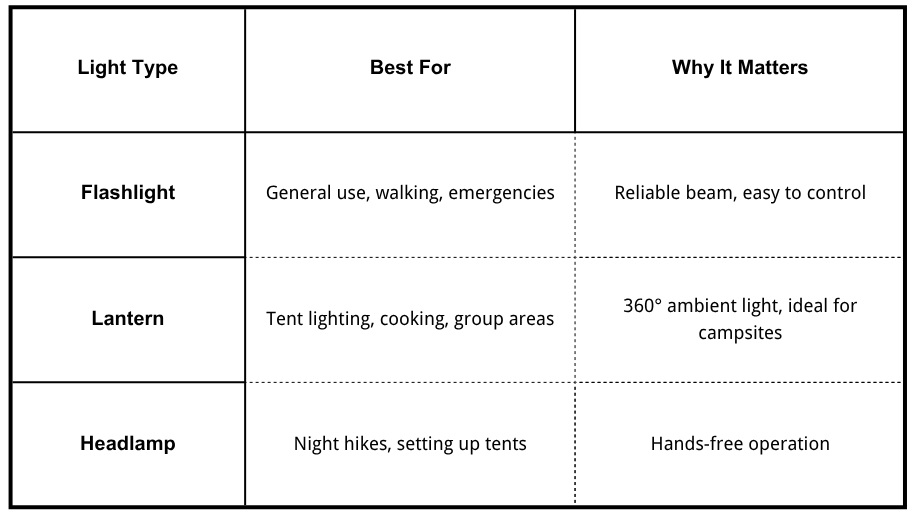 Each light type serves a unique purpose—flashlights for control, lanterns for ambiance, and headlamps for hands-free tasks. If you're aiming for both safety and comfort, a well-balanced mix of all three is your best bet.
