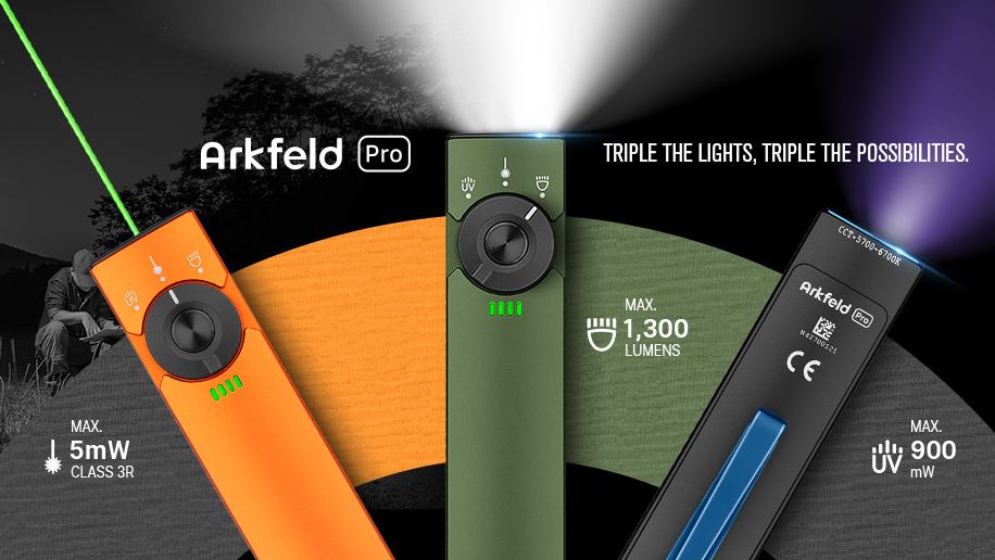 Building upon the success of the original Arkfeld and Arkfeld UV, the Arkfeld Pro boasts enhanced performance across all three lighting options. With a maximum output of 1,300 lumens for white light, a Class 3R (≤5mW) 520nm wavelength green laser, and a powerful 900mW UV light at a 365nm wavelength, this flashlight is truly multifunctional.
