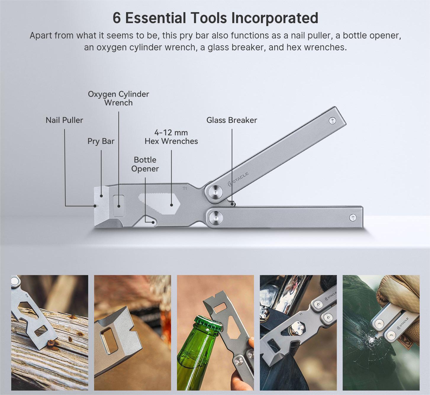 With its ingenious 6-in-1 design, Otacle T1 features a pry bar, nail puller, oxygen cylinder wrench, bottle opener, glass breaker, and hex wrenches, it's your all-in-one solution for any challenge nature presents.