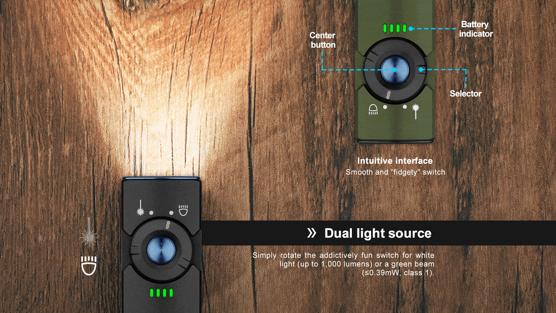 ● Dual Light Source EDC Flashlight: White light in 5 brightness levels with a max output of 1,000 lumens, and the output of green beam is ≤0.39mW, Class 1. The light's memory function enables you to save your favorite mode so it's always ready!