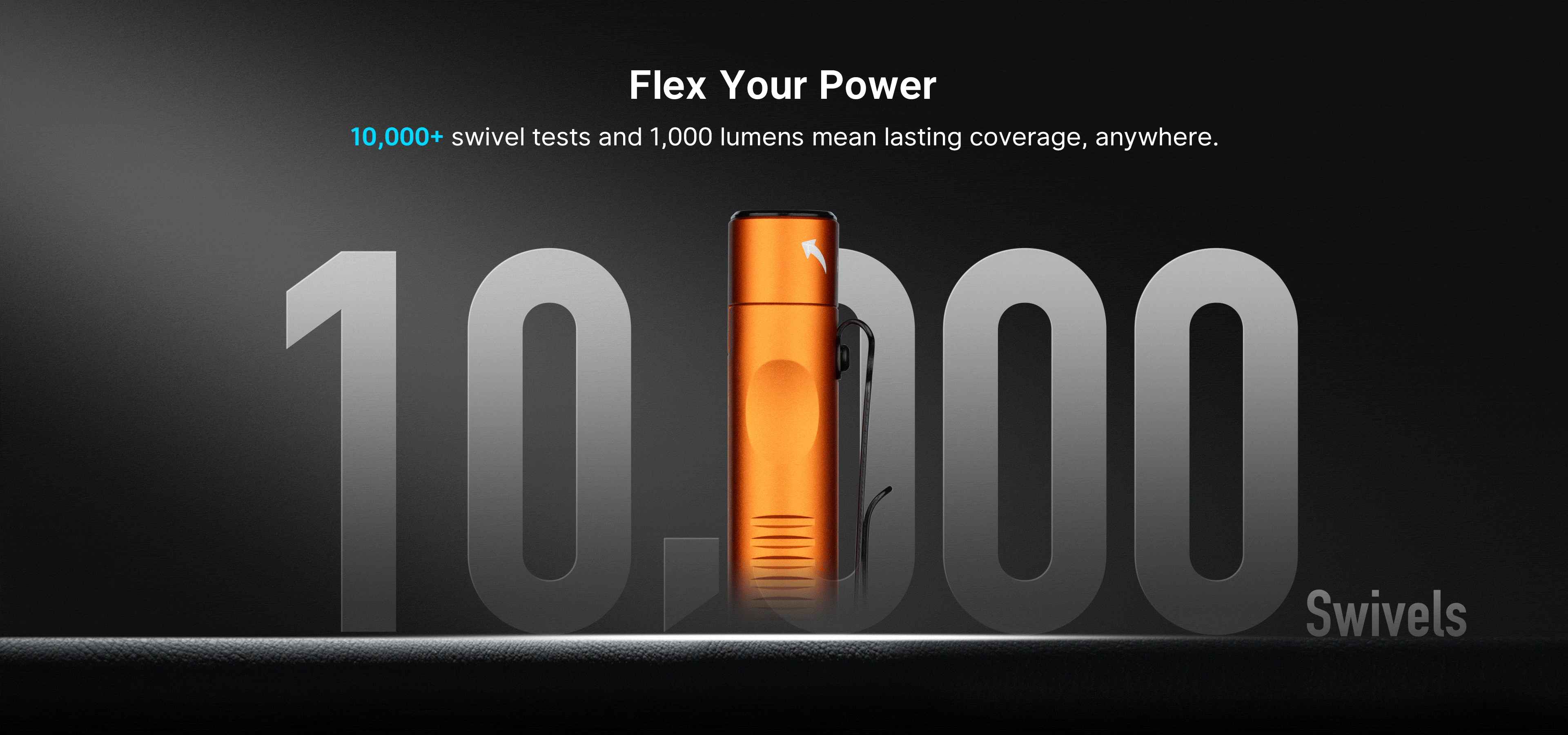 Olight didn't just create an articulating head; We perfected it with a non-wire hinge. Validated through an impressive 10,000 swivel test, this hinge guarantees a continuous and consistent lighting experience. Position the light at just the right angle for your needs and have total confidence that the hinge will hold it there securely!