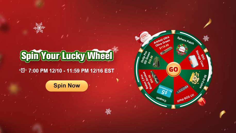 This favorite is back! Get ready to add some extra excitement to your holiday season with the Christmas Gifts Lucky Wheel! It packed with incredible prizes like the Arkfeld Ultra Olive Green flashlight, Oclip Pro OD Green, Baton 3 Pro Brush Strokes, stylish i3T EOS plaid flashlight, Sphere Patch, and so much more!