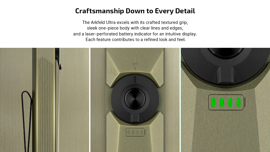 Navigating the various lighting modes of the Arkfeld Ultra is a simple and intuitive process, thanks to the user-friendly selector switch. With just a flick of the switch, you can seamlessly transition between the white light, UV light, and green laser beam, allowing for quick and precise adjustments tailored to your specific needs. This streamlined operation ensures that you can adapt to changing lighting requirements on the fly, without any complicated procedures or delays. Whether you need to switch between lighting modes quickly during a presentation or adjust the brightness for different tasks, the Arkfeld Ultra's selector switch makes it easy to customize your lighting experience with a single touch.