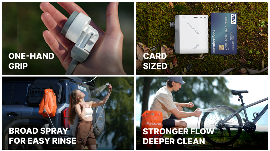 Weighing just 200g and smaller than most smartphones, it's incredibly easy to carry. Its spray area covers 78.5 cm²—twice the size of typical portable showers—ensuring a wide, comfortable rinse. Beyond rinsing off sweat and dirt, it's also perfect for quick cleaning tasks, whether that's washing gear or tidying up after a messy meal.