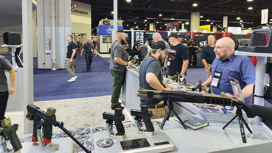 As befitting their first time at the NRA Annual Meetings & Exhibits, Osight wasn't content to offer a bland, passive visitor experience. A bespoke booth layout for #3413 resulted in a roomy layout that guided attendees through their first experience with the Osight brand before culminating in some hands-on competition. Osight shooters brought out an array of test platforms, giving audiences a chance to experience Osight S and Osight X on everything from subcompact carry guns to full-size battle rifles.