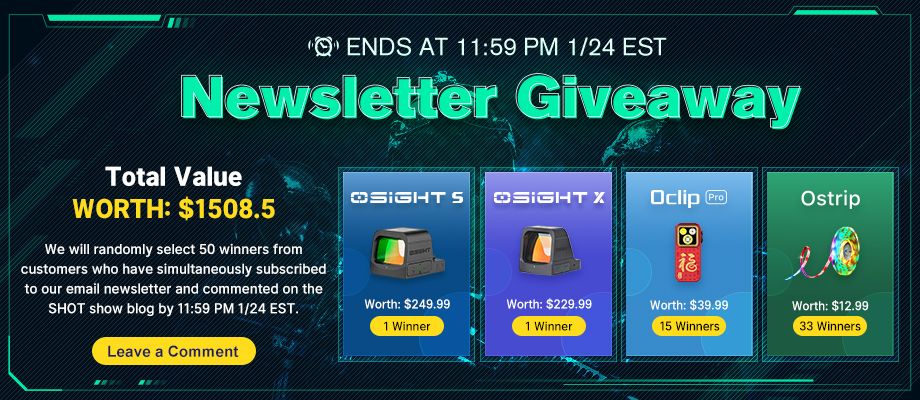 Dive into the thrill of our SHOT Show GAW event, where the total prize value exceeds $1508, including the highly anticipated Osight S and several other exciting new products. Subscribe to our newsletter, comment on this blog, and share your thoughts about our all-new Osight series. We'll pick 50 winners at random and announce them here. Good luck to all!