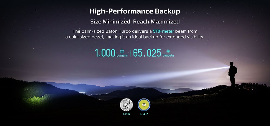◆ Size Minimized, Reach Maximized: The palm-sized Baton Turbo delivers a 510-meter beam from a coin-sized bezel, making it an ideal backup for extended visibility.