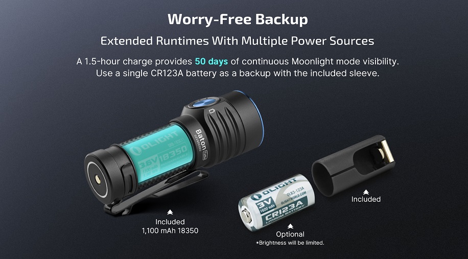 ◆ Worry-Free Battery Backup: Dual battery options power sources.Featuring an included rechargeable 18350 battery and the option to swap in CR123A batteries, a 1.5-hour charge provides 50 days of continuous Moonlight mode visibility.