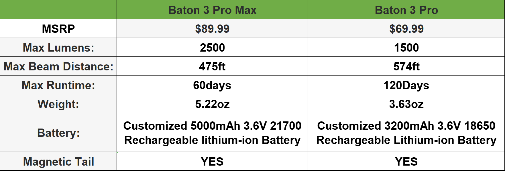 Quick Comparison Chart of the Olight Baton 3 Pro and Baton 3 Pro max