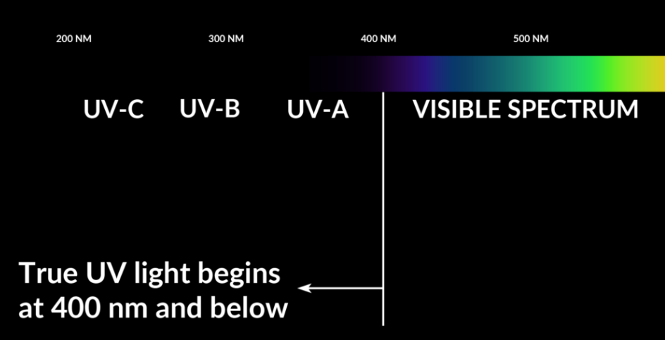 UV is short for Ultraviolet. lt is a type of invisible purple light that lies between visible light and X-rays along the electromagnetic spectrum.UV "light" usually spans a range of wavelengths between about 10 and 400 nanometers. The brightness of UV light is not reflective of its performance. the wavelength is what really matters.UV radiation is divided into three categories based on wavelength: UVA (400-315 nm), UVB (315-280 nm), and UVC (280-100 nm).